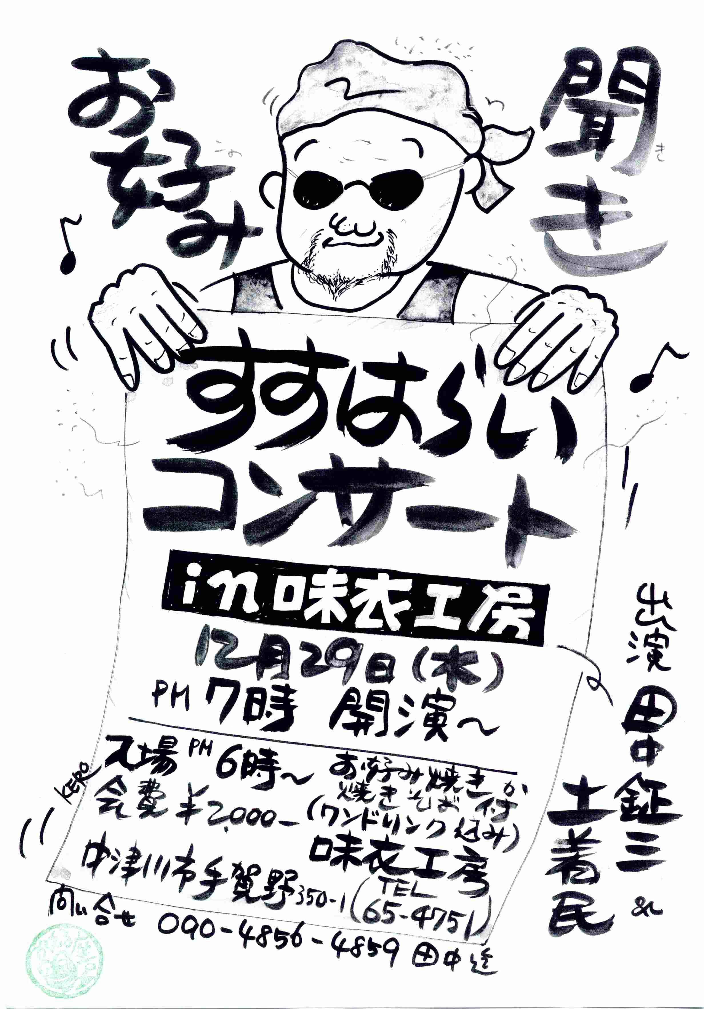 | 12月29日(水) | 「歳忘れすすはらいコンサート2004」土着民&田中鉦三 開場18時 開演19時 2000円(お好み焼き等と1ドリンク付)定員40名 チラシ |